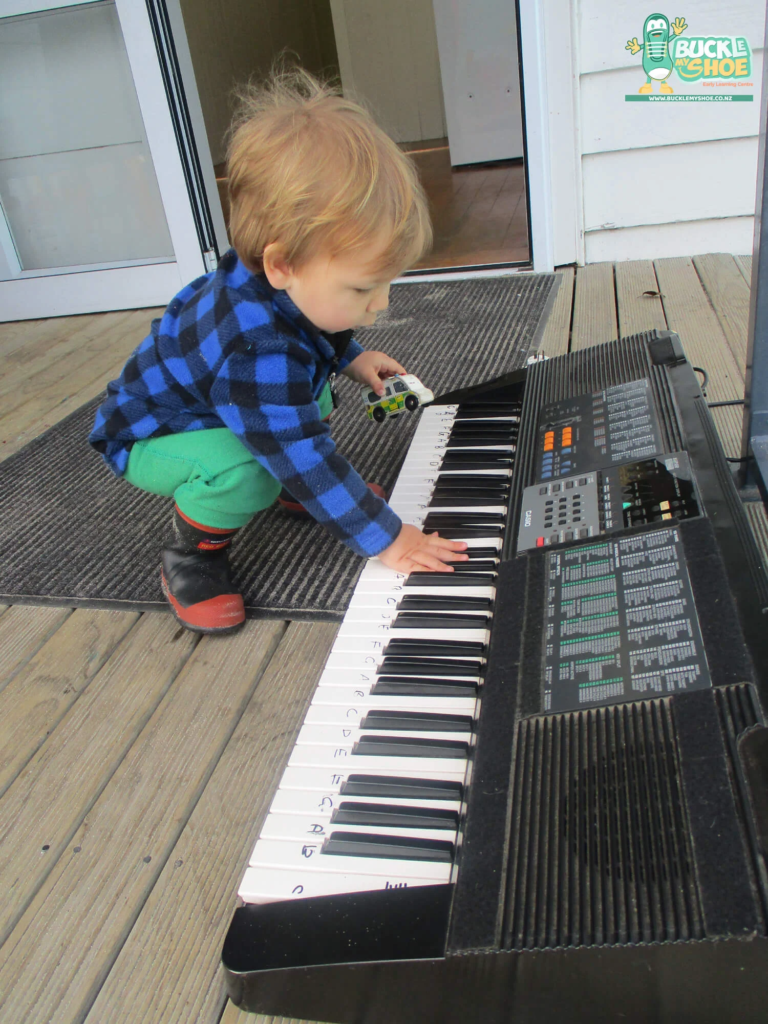 When the children arrived at Buckle My Shoe, they noticed something different set up in the Under 2’s room. “Who brought that?”, some little ones questioned. “Does it work?”, some inquired. “I think it’s a piano!”, others shared. With so much conversation happening around this new object, we decided to bring the object out on the deck – ready for our eager explorers to get their thinking on! 😊